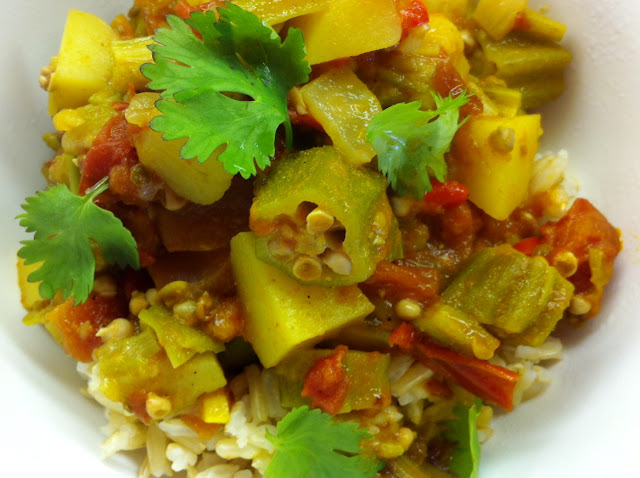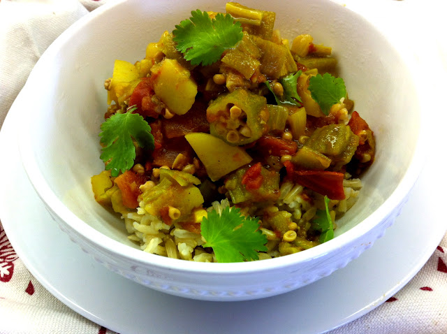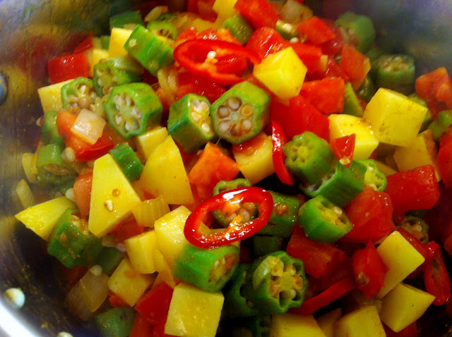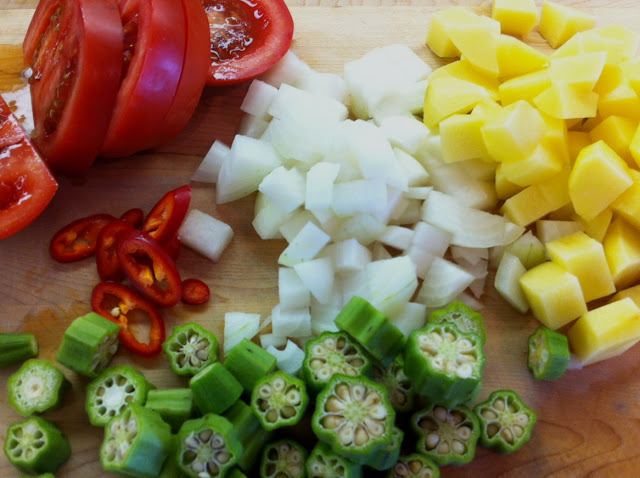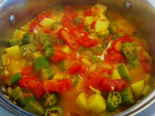 vegetarian curried okra (why) stew, (because) it's a good thing!