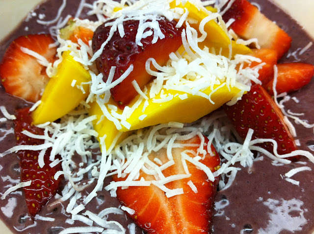top the cold acai mixture with your favorite cut up fruits & berries, coconut flakes, chia seeds, cocoa nibs, a good quality granola, drizzle of agave syrup, or a dollop of almond butter. enjoy as soon as possible before it melts!